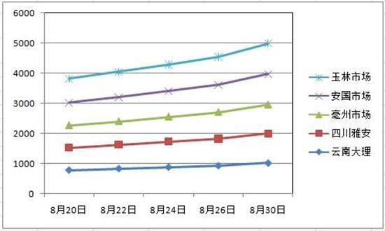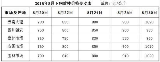 2016年7月25日,鑒于重樓人工種植及野生資源供給量持續(xù)下降、家種難以支撐以及企業(yè)批量采購等影響,上周重樓已突破千元大關。隨著重樓集中產新結束,重樓價格行情在8月下旬開始發(fā)動,從740元-790元(公斤價,下同)價位一路上行,到8 月30日已經達到960元-1020元高位,漲幅高達30%以上!